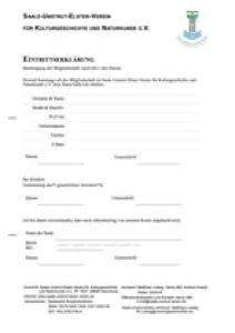 Möchten Sie den Saale-Unstrut-Elster-Verein für Kulturgeschichte und Naturkunde e.V. unterstützen und beitreten? Im Folgenden finden Sie die Vereinssatzung und eine Eintrittserkärung als PDF-Dateien zum Herunterladen. Schicken Sie die ausgefüllte Erklärung bitte an die oben genannte Adresse.